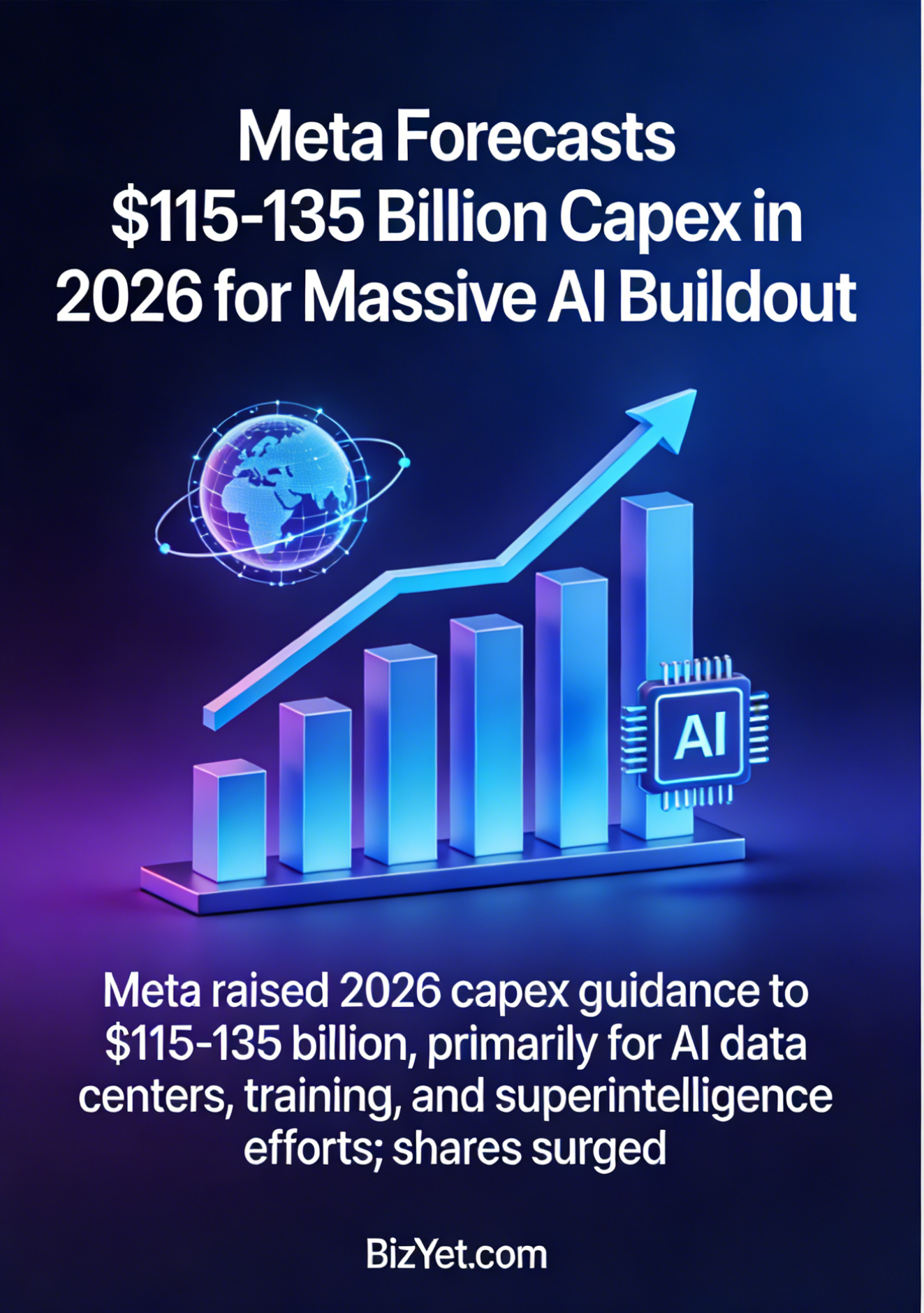 Meta raised 2026 capex guidance to $115-135 billion, primarily for AI data centers, training, and superintelligence efforts; shares surged.